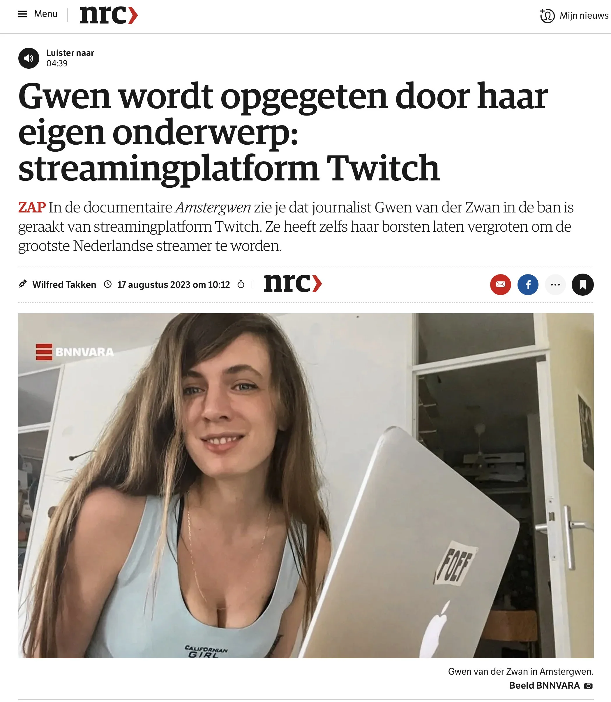 De documentaire ‘Amstergwen’ volgt de virtuele ontdekkingsreis van journalist en schrijver Gwen van der Zwan door de wereld van Twitch, een online video- en chatplatform waar livestreams bekeken en gedeeld kunnen worden. Een jaar lang begeeft Gwen zich undercover op het platform en onderzoekt hoe het is om je leven live op internet te delen, wat de rol is van vrouwen op dit platform en wat de snelste weg is naar succes. Hierbij treft ze een cocktail aan van haat, geld, dreigementen, liefdesverklaringen, pesterijen en vrouwenobjectivering. Haar onderzoek leidt tot een reis waarin ze de controle over haar leven dreigt te verliezen. ‘Amstergwen’ is dinsdag 15 augustus te zien om 21:10 uur bij BNNVARA op NPO 3.