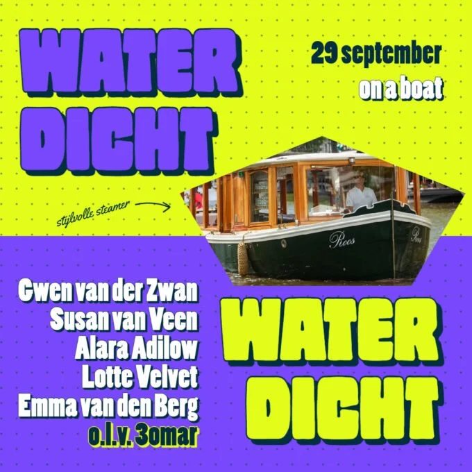 We gaan het water op! Samen met Omar Dahmani organiseren we Waterdicht: een nieuw SLAA-programma vol poëzie en proza met uitzicht over de grachten van Amsterdam. Luisterend naar nieuwe stemmen varen we rond op salonboot Roos, een stijlvolle steamer uit 1904. Op de line-up staan Gwen van der Zwan, Susan van Veen, Lotte Velvet, Alara Adilow en Emma van den Berg onder leiding van 3omar. Het wordt een hefla dus koop snel je kaartje.